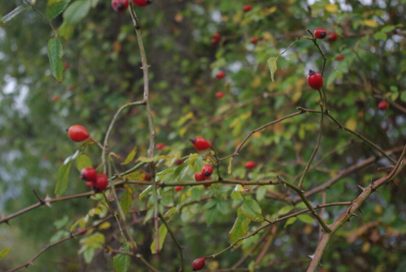 Je fut attiré par les derniers vestiges de la vie sauvage qui bordait l'ancienne clôture : les branches dénudées d'un églantier étaient piquées de baies d'un rouge vif et audacieux les cynorrhodons. Ces éclats de couleur intense, minuscules mais résistants, étaient les seuls points chauds dans la monochromie du paysage, un signe de résistance face à l'arrivée imminente du froid.